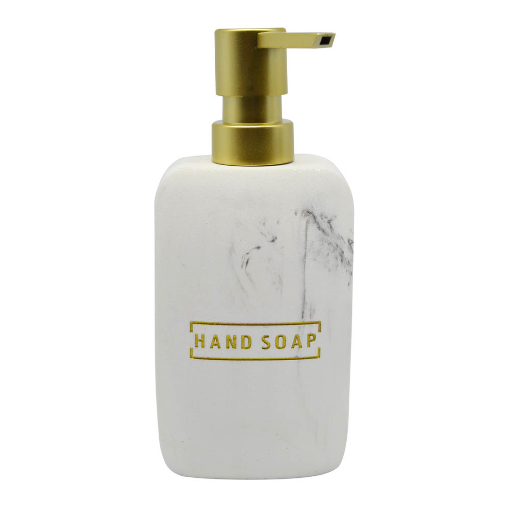 Σαπουνοθήκη για υγρό σαπούνι πολυεστερική, διακόσμηση εφέ άσπρο μάρμαρο, χρυσή επιγραφή και αντλία σε χρυσό ματ χρώμα . Αξεσουάρ μπάνιου εξαιρετικής ποιότητας με...