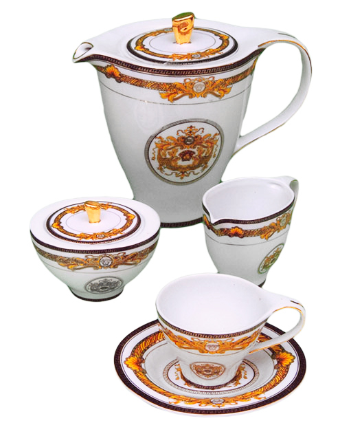 Σερβίτσιο τσαγιού 15 τεμαχίων από υψηλής ποιότητας πορσελάνης, με κλασικό μπαρόκ σχέδιο σε μια πλούσια χρυσή -λευκή απόχρωση.Το σετ αποτελείται: 6 φλυτζάνια του τσαγιού, 6 πιατάκια,1 τσαγιέρα, 1 γαλατιέρα, 1 ζαχαριέρα.