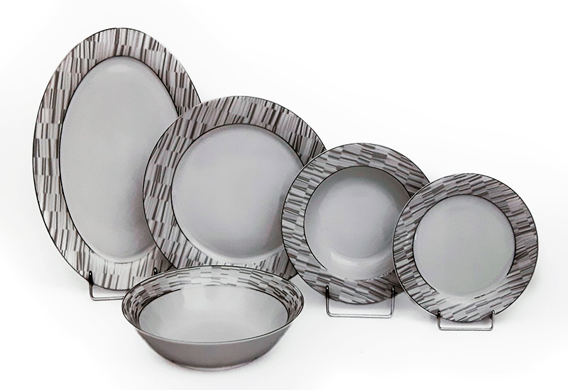 Σερβίτσιο φαγητού 20 τεμαχίων από υψηλής ποιότητας πορσελάνης, με περιμετρικά σχεδια σε ασημί και γκρι χρωματισμό και ρίγα πλατίνας.Το σετ αποτελείται:1 Πιατέλα1 Σαλατιέρα6 Πιάτα Βαθιά6 Πιάτα Ρηχά6 Πιάτα Φρούτου