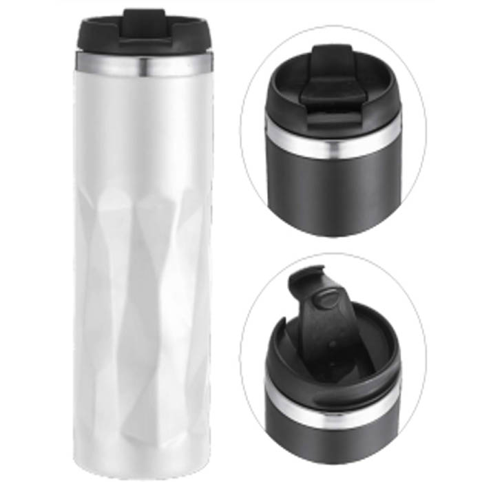 Ποτήρι ανοξείδωτο ισοθερμικό σε λευκό χρώμα και σχέδιο διαμαντιού, το οποίο διατηρεί το ρόφημα σας για αρκετή ώρα στην επιθυμητή θερμοκρασία. Το κούμπωμα του είναι πλαστικό και διαθέτει θέση για καλαμάκι.