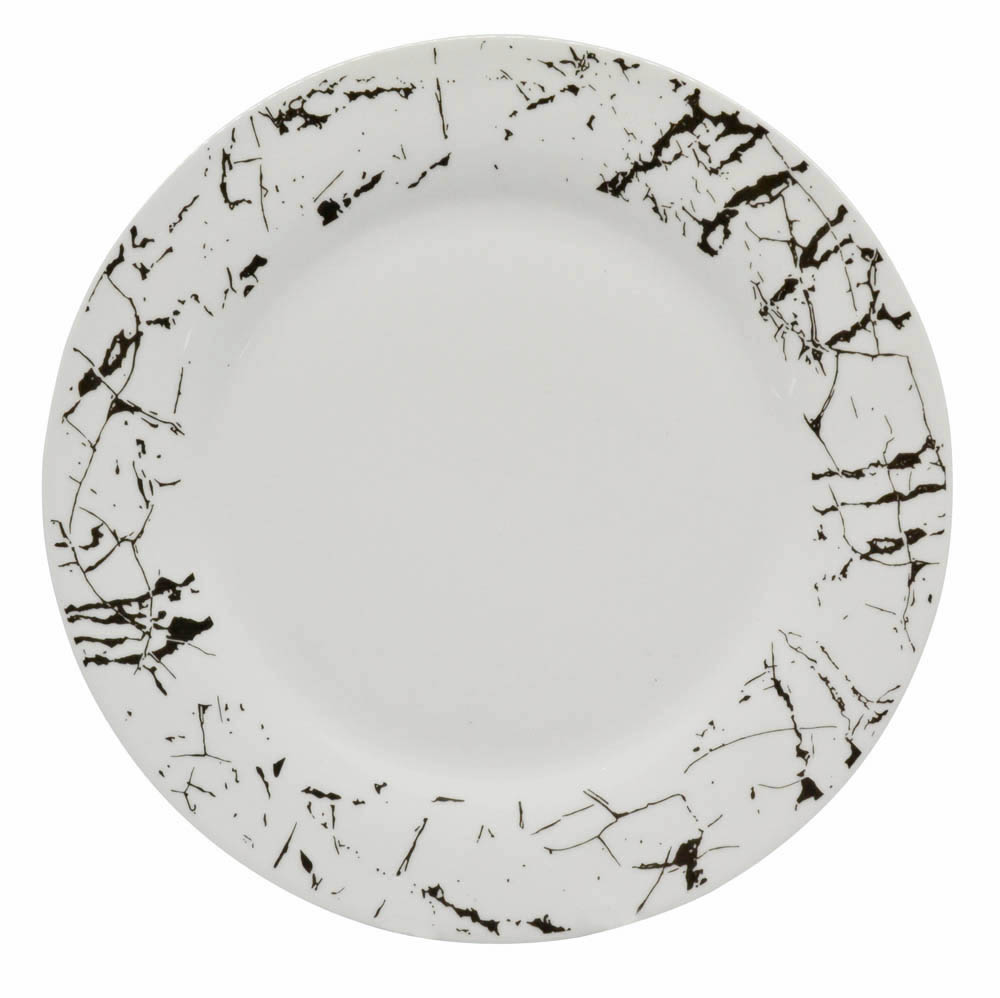 Πιάτο ρηχό από ποιοτική πορσελάνη, στρογγυλό σε λευκό χρώμα και διακόσμηση εφέ μαύρο μάρμαρο περιμετρικά του πλαισίου. Ποιοτικά πιάτα για το καθημερινό σας τραπέζι και όχι μόνο, κατάλληλα για το πλυντήριο πιάτων και τον φούρνο μικροκυμάτων.