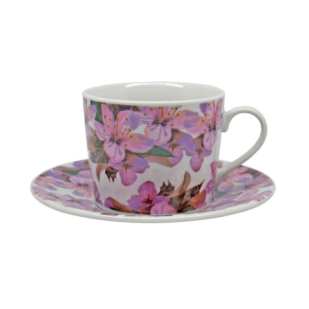 Σετ 6 τεμαχίων φλυτζάνια για τσάι με πιατάκια κατασκευασμένα από πορσελάνη, με σχέδιο μωβ λουλούδια και σε συσκευασία δώρου. Σερβίρετε και απολαύστε το αγαπημένο σας ρόφημα.Κατάλληλα για χρήση στο πλυντήριο πιάτων.