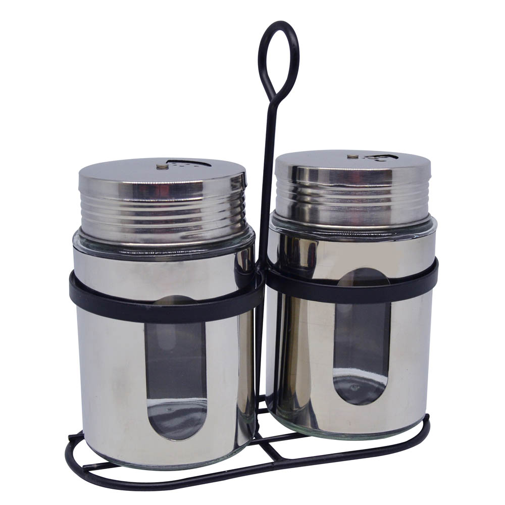 Σετ 2 τεμαχίων βαζάκια μπαχαρικών ανοξείδωτα γυάλινα εσωτερικά με μαύρη μεταλλική βάση.