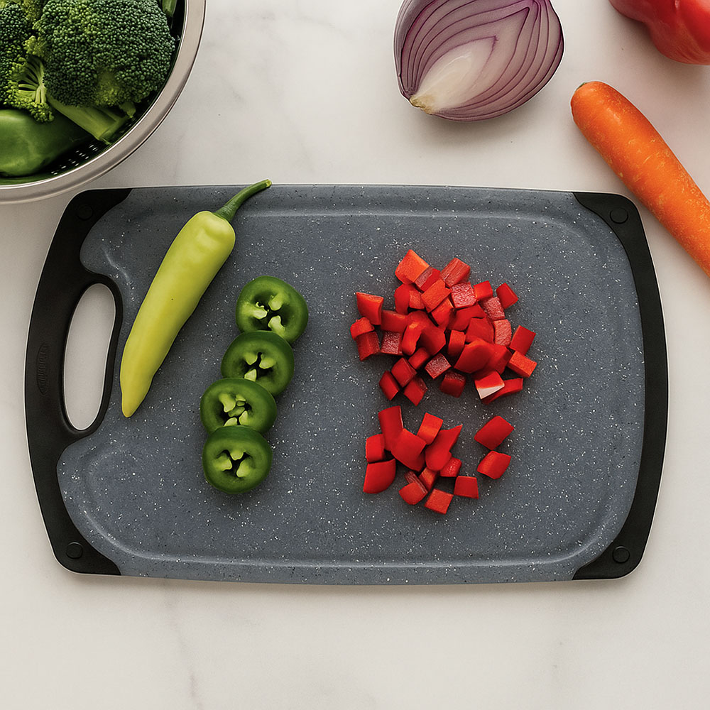Πλαστική επιφάνεια κοπής σε γκρι χρώμα με διακόσμηση εφέ μάρμαρο. Έχει λαβή για εύκολη χρήση και αντιολισθητικά ποδαράκια για μεγαλύτερη ασφάλεια. Χωράει σε όλες τις γούρνες και μπορεί να μπει στο πλυντήριο πιάτων. Χρηστικά αντικείμενα με μοντέρνο και κομψό σχεδιασμό απαραίτητα για κάθε κουζίνα. Οργανώστε τον χώρο σας διαλέγοντας ανάμεσα από την μεγάλη ποικιλία της σειράς μας!