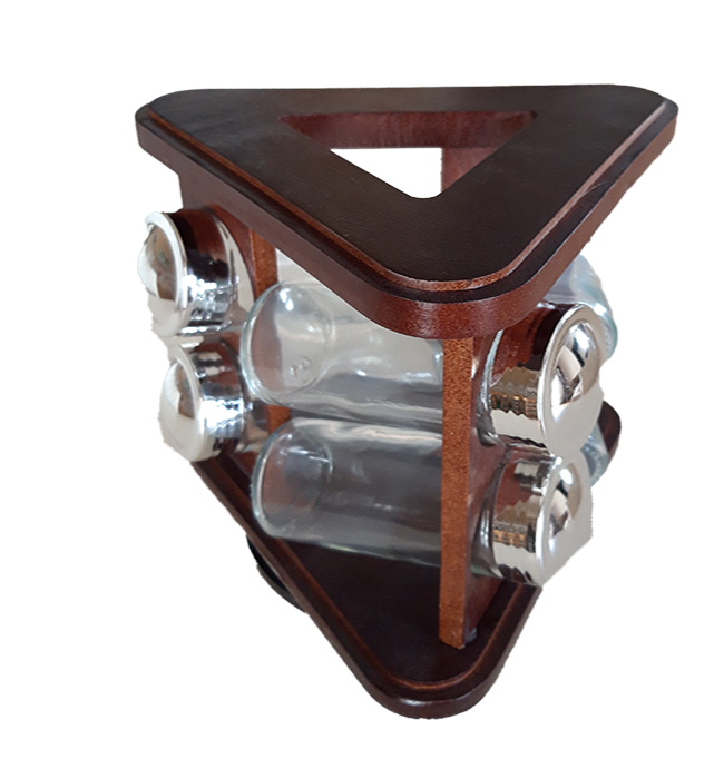 Σετ βαζάκια μπαχαρικών γυάλινα 6 τεμαχίων με ξύλινη περιστρεφόμενη βάση, που παρέχει οργανωμένο χώρο αποθήκευσης για τα μπαχαρικά, τα καρυκεύματα και τα βότανα.