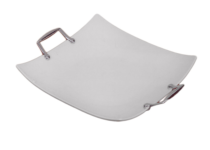 Πιατέλα τετράγωνη λευκή από υψηλής ποιότητας πορσελάνης με κεραμικές λαβές ασημί 33x33εκ.