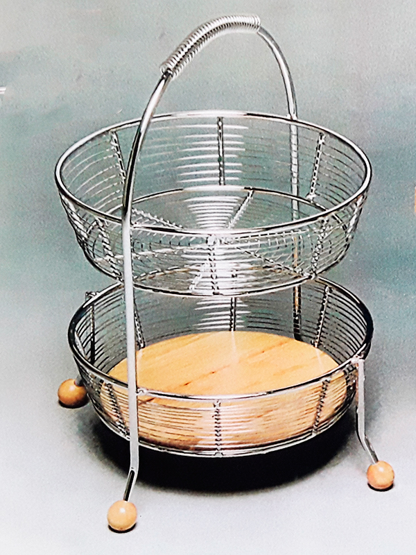 Διώροφος μεταλλική επιτραπέζια φρουτιέρα με ξύλινη καφέ και κερασί βάση.45x28cm