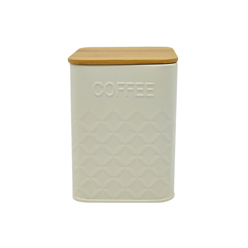 Βάζο αποθήκευσης μεταλλικό σε μπεζ ματ χρώμα με ανάγλυφη διακόσμηση, επιγραφή Coffee και κούμπωμα από ξύλο μπαμπού.