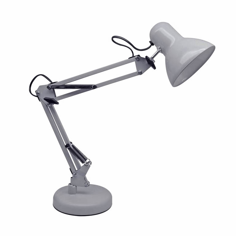 Φωτιστικό γραφείου μεταλλικό σε γκρι χρώμα, ρυθμιζόμενο διπλό βραχίονα και περιστρεφόμενη κεφαλή. Τύπος λαμπτήρα Ε27.