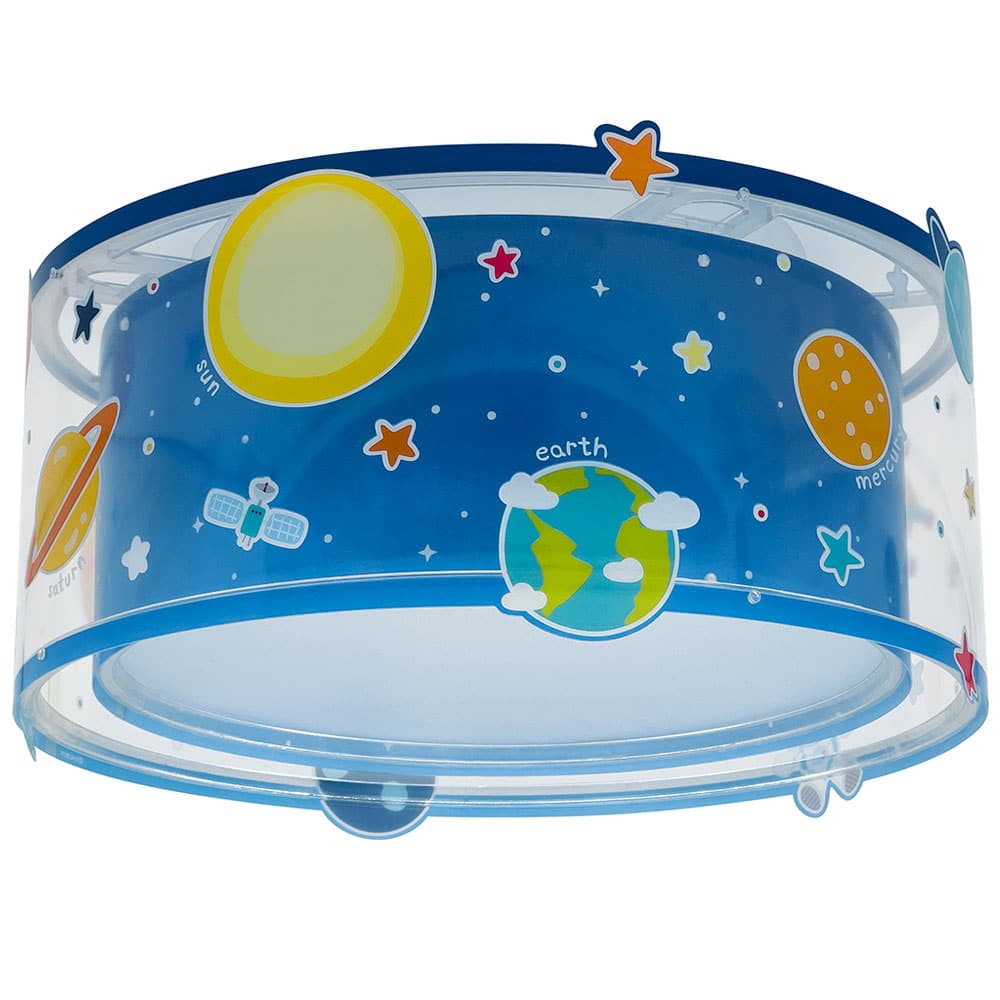 Παιδικό φωτιστικό οροφής τύπου πλαφονιέρα κατάλληλο για γενικό φωτισμό και όλες τις δραστηριότητες των παιδιών. Είναι διπλού τοιχώματος από άκαυστο λεπτό πολυπροπυλένιο και φωσφορίζοντα στο σκοτάδι εξωτερικά μέρη. Τοποθετείται εύκολα και γρήγορα και είναι εφοδιασμένο με δύο θέσεις λαμπτήρων LED για πραγματικά άπλετο φως στο δωμάτιο. Παρέχεται διαχυτής φωτός για τις μικρότερες ηλικίες που προσφέρει ομοιόμορφο φωτισμό αλλά και προστασία. Κατασκευασμένο εξ ολοκλήρου στην Ευρώπη το Planets πλαφονιέρα οροφής, συμπληρώνει τα υπόλοιπα παιδικά φωτιστικά της συλλογής κομοδίνου, απλίκα ή νυκτός.