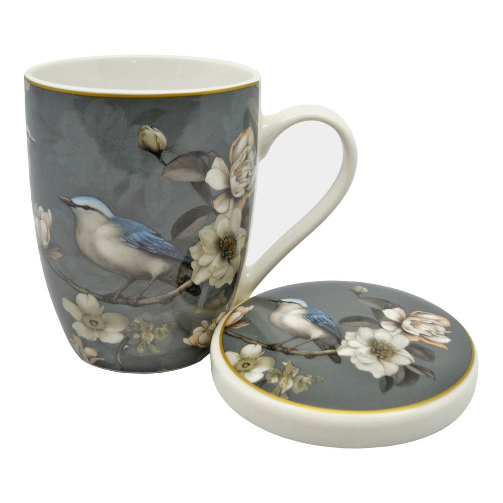 Κούπα με καπάκι από ποιοτική πορσελάνη Bone China, σχέδιο σπουργίτι, σε συσκευασία δώρου. Κατάλληλη για πλυντήριο πιάτων και φούρνο μικροκυμάτων.