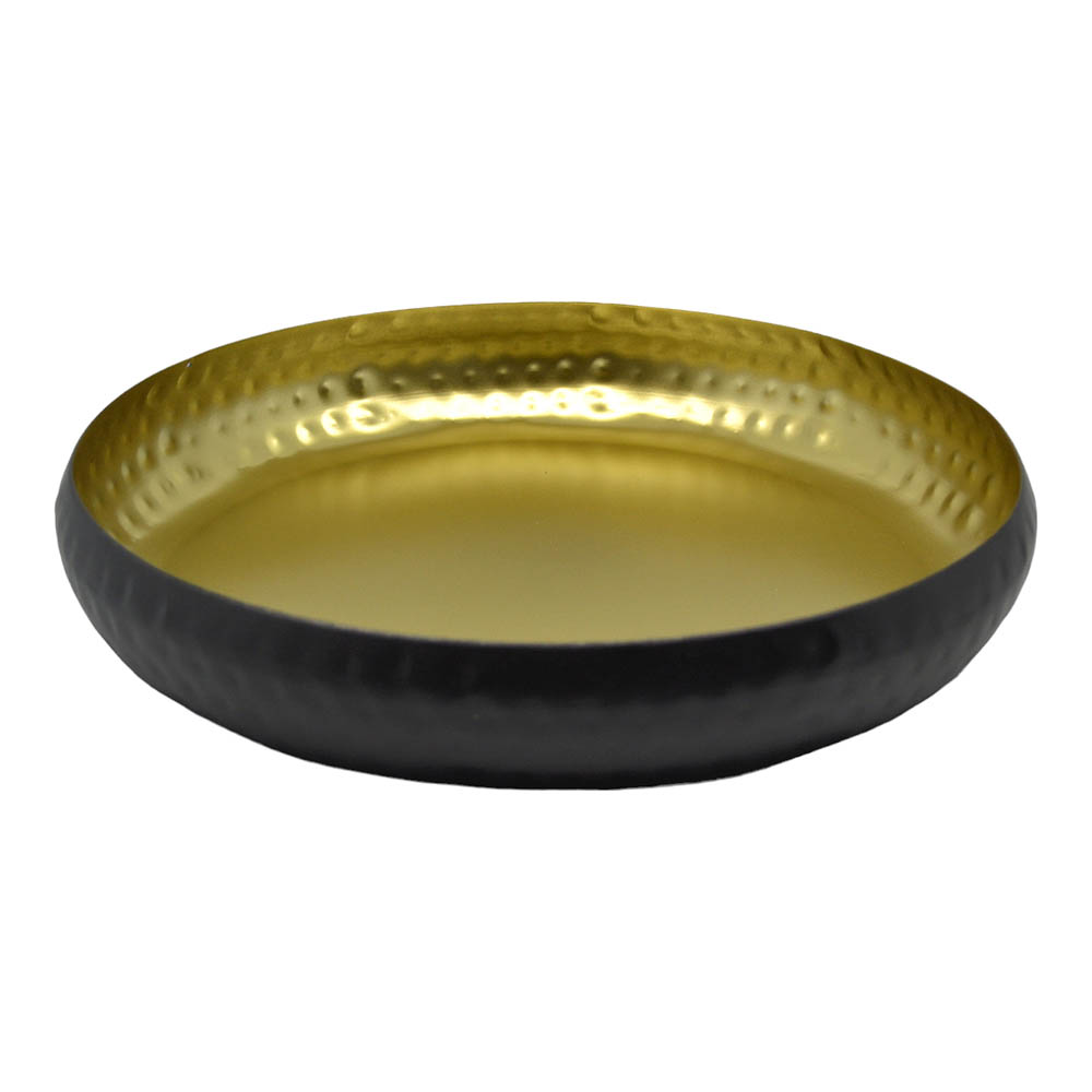 Διακοσμητική πιατέλα μεταλλική που ενώνει τον μοναδικό σχεδιασμό με την πολυτέλεια των χρωμάτων. Η εξωτερική της επιφάνεια είναι σε μαύρο χρώμα ενώ το εσωτερικό της σε χρυσό. Το φινίρισμα με σφυρήλατες λεπτομέρειες προσδίδει έναν αέρα μοναδικότητας.