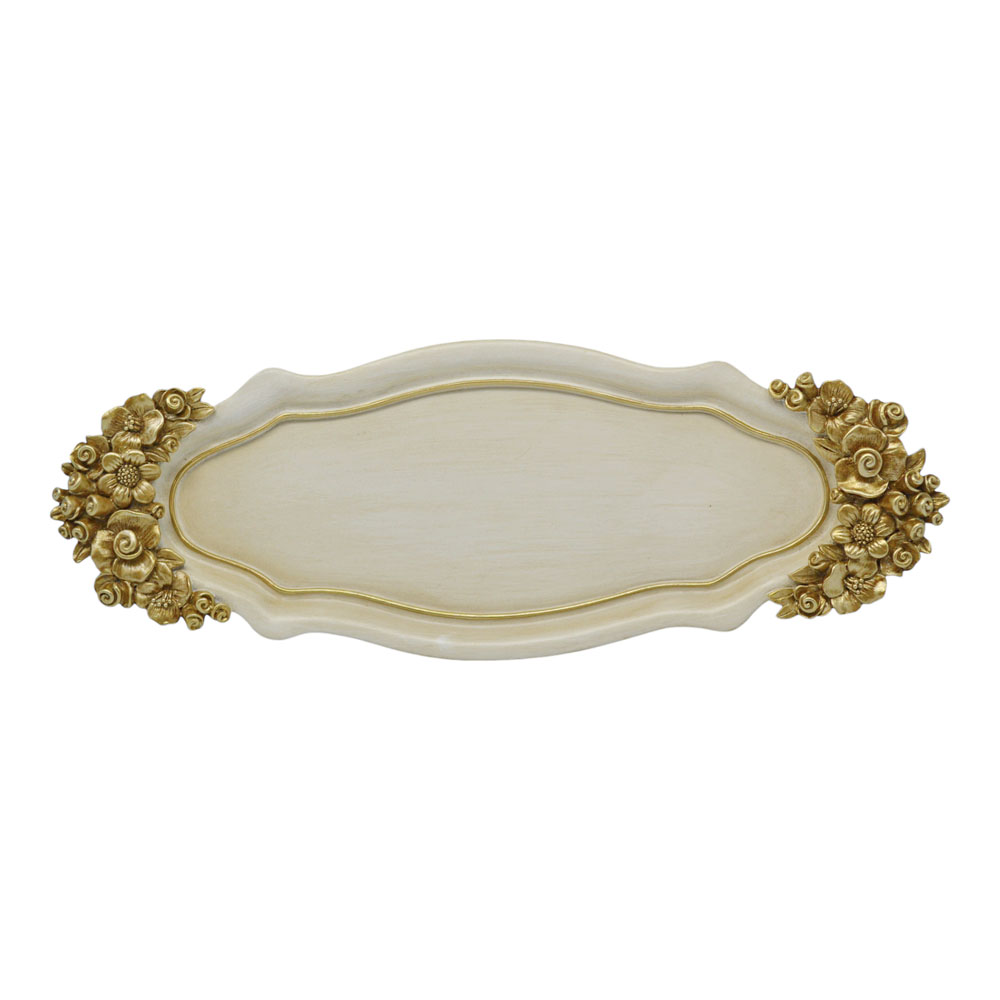 Διακοσμητικός δίσκος με λεπτομερείς χρυσές ανάγλυφες διακοσμήσεις και λουλουδάτα μοτίβα στις λαβές. Είναι ιδανικός τόσο για καθημερινή χρήση όσο και για διακοσμητικό κομμάτι στον χώρο σας. Προσθέτει μια vintage αισθητική στην παρουσίαση του τραπεζιού σας.