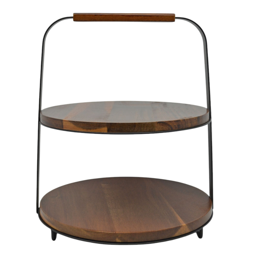 Ξύλινη εταζέρα δύο ορόφων με μαύρο μεταλλικό σκελετό και εργονομική λαβή. Οι δίσκοι από φυσικό ξύλο προσφέρουν ζεστασιά και κομψότητα, ενώ ο μοντέρνος σχεδιασμός την καθιστά ιδανική για σερβίρισμα ή διακόσμηση τραπεζιού.