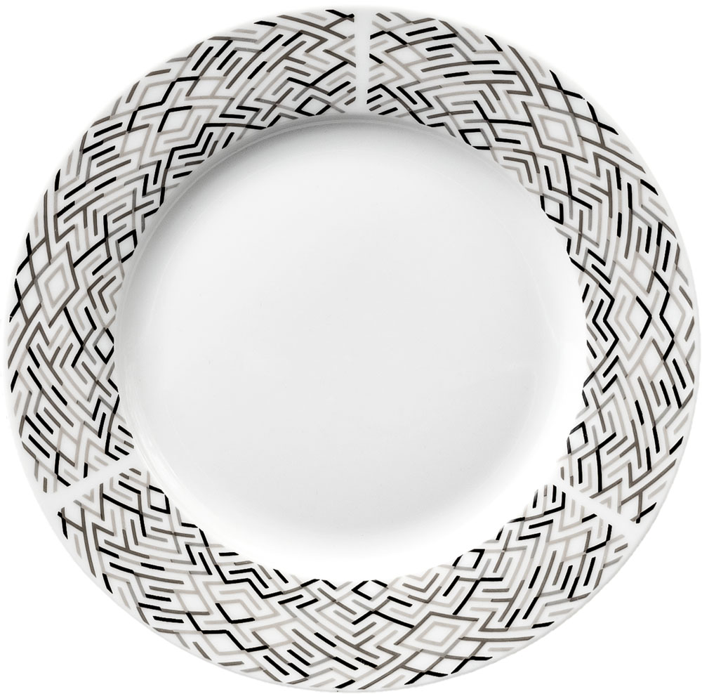 Πιάτο φρούτου από ποιοτική πορσελάνη, στρογγυλό σε λευκό χρώμα και διακόσμηση γκρι και μαύρες γραμμές περιμετρικά του πλαισίου. Ποιοτικά πιάτα για το καθημερινό σας τραπέζι και όχι μόνο, κατάλληλα για το πλυντήριο πιάτων και τον φούρνο μικροκυμάτων.