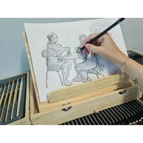 PAINTING SET IN A CASE 83 PIECES WITH EASEL 83 ELEMENTS – the painting set in a suitcase has many elements, including: a suitcase with an easel, a sketchbook, 10 painting brushes, 12 pencils of various softness (2xH, 2 HB, 2xB, 2x2B, 2x4B, 2x6B), an eraser, a sharpener, 8 acrylic paints, a palette, 12 watercolor paints, 28 colored pencils, 8 oil pastels. PRACTICAL SUITCASE WITH 2 DRAWER AMI – the art set has a practical wooden case, which is equipped with a lock and a handle. Thanks to this Transporting the contents of the suitcase is comfortable and very simple . EASEL IN A SUITCASE – the case is equipped with a fold-out easel. The whole thing is made of pine wood and already contains everything you need to start painting immediately. You don't have to buy anything else – paints, brushes, crayons and pencils are all within reach. EASY ACCESS TO INDIVIDUAL ELEMENTS - each element of the set has special compartments that allow quick and easy access to accessories, while ensuring their protection and keeping them organized. SPECIFICATION – material: wood; lockable case: yes; handle: yes; dimensions: 35 x 26.5 x 11 cm; weight: 2.381 kg weight in packaging: 2.634 kg