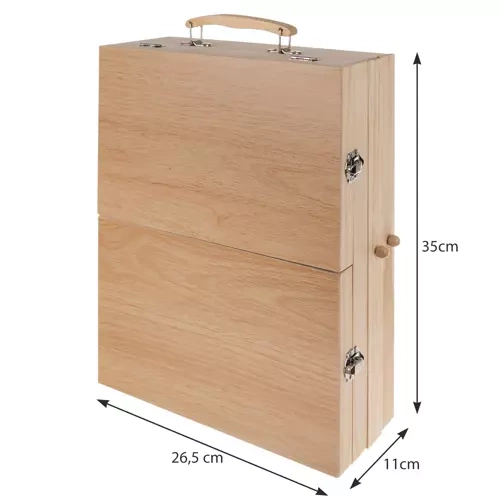 material: wood lockable suitcase: yes handle: yes dimensions: 35 x 26.5 x 11 cm weight: 2,381 kg packaged weight: 2.634 kg