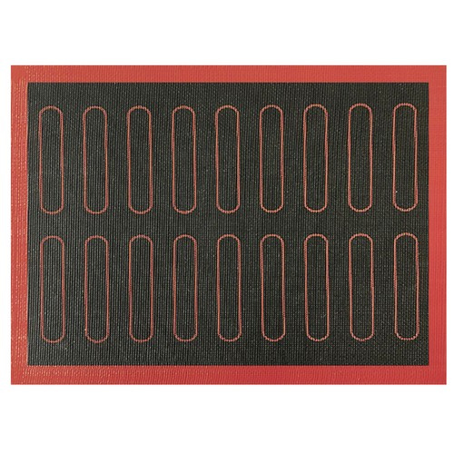 LARGE SILICONE BAKING MAT 30x40cm HAS MICRO PERFORATED – this micro-perforated mat means faster heat distribution and moisture evaporation. Thanks to the holes the heat spreads evenly across the surface of the mat, guaranteeing perfect baking both on the top and bottom. DOUBLE SIDED – the mat is double-sided. On one side there is a printed pattern of an “elongated” cookie, eclair type, which makes it easier to spread the dough on the cookies. The other side is without a pattern. SILICONE WITH FIBERGLASS – the mat is made of silicone with a fiberglass core, which means it can withstand both high and low temperatures. The mat is non-stick , which means there is no need to use additional baking paper when baking. ANTI-SLIP – the structure of the mat is anti-slip, it does not move on the countertop, baking tray or mesh when applying the dough. SPECIFICATION - material: silicone with fiberglass core; color: black / orange; size of "cookie" on the pattern: 10 x 2 cm; size: 30 x 40 cm; weight: 67 g; weight in packaging: 74 g.