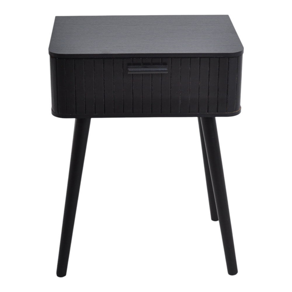 Κομοδίνο με συρτάρι με μοντέρνο σχεδιασμό, σε μαύρη απόχρωση. Διαθέτει επιφάνεια και πλαϊνά με φυσική υφή ξύλου, μπροστινό μέρος με κάθετες γραμμώσεις και εργονομική λαβή. Στηρίζεται σε τέσσερα ξύλινα πόδια που προσφέρουν σταθερότητα και κομψότητα.