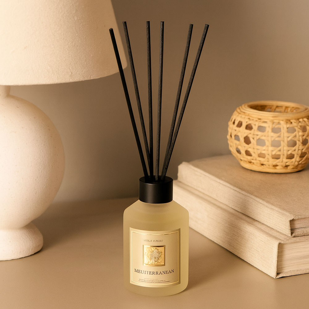 Αρωματικό χώρου με εκλεπτυσμένο άρωμα εμπνευσμένο από τη φρεσκάδα και τη ζεστή αύρα της Μεσογείου. Το ματ γυάλινο μπουκάλι με χρυσή ετικέτα και μαύρα sticks προσφέρει διακριτική και σταθερή διάχυση, προσθέτοντας παράλληλα ένα premium στοιχείο διακόσμησης