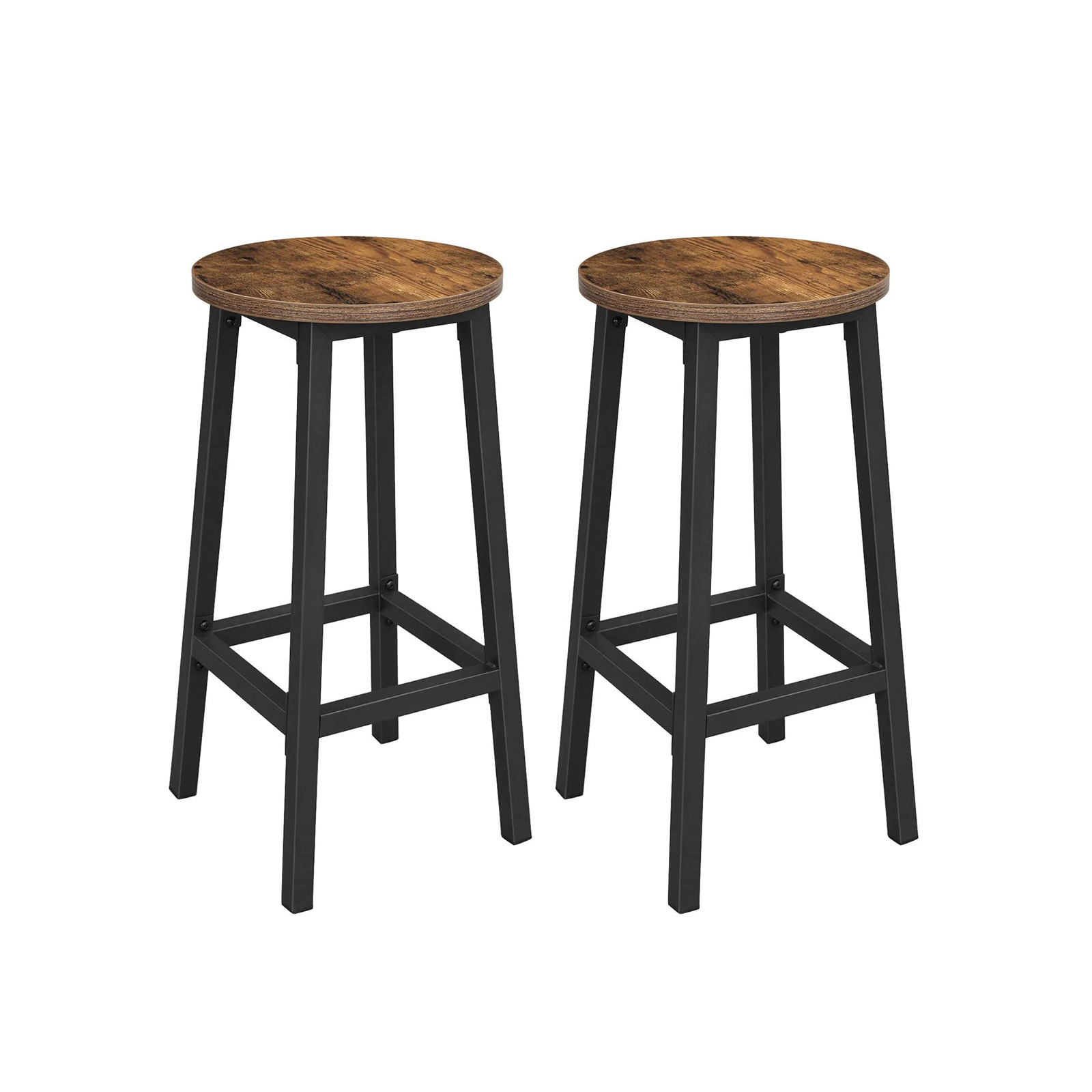 Σετ 2 σκαμπό μπαρ VASAGLE ύψους 65 cm με στρογγυλή επιφάνεια rustic καφέ και μεταλλικό μαύρο σκελετό. Στιβαρή industrial κατασκευή, εύκολη συναρμολόγηση και δυνατότητα αποθήκευσης κάτω από τον πάγκο.